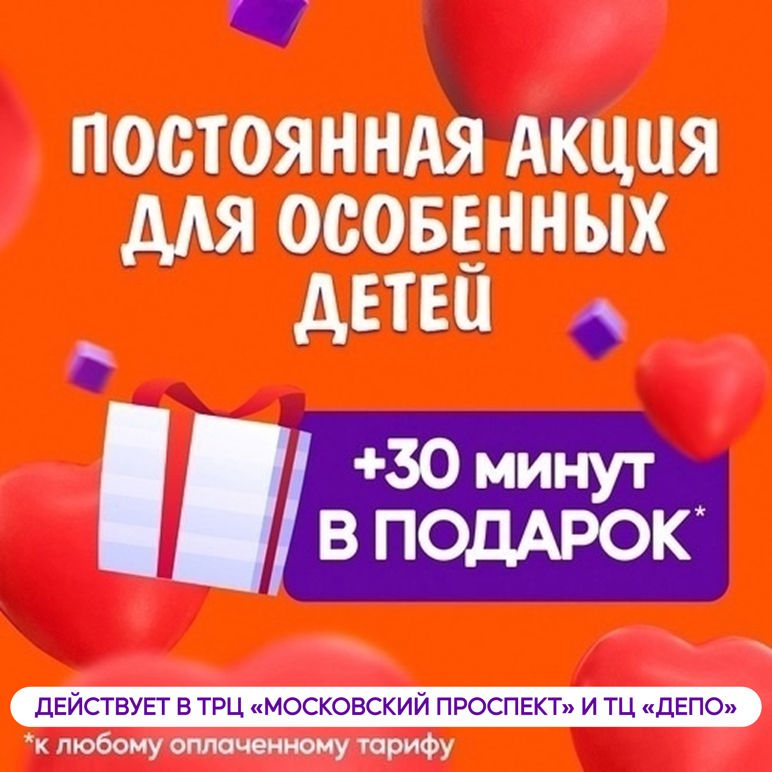 Акция для детей с ОВЗ. Дарим + 30 мин к любому оплаченному тарифу при предъявлении подтверждающего документа. Сопровождение обязательно.